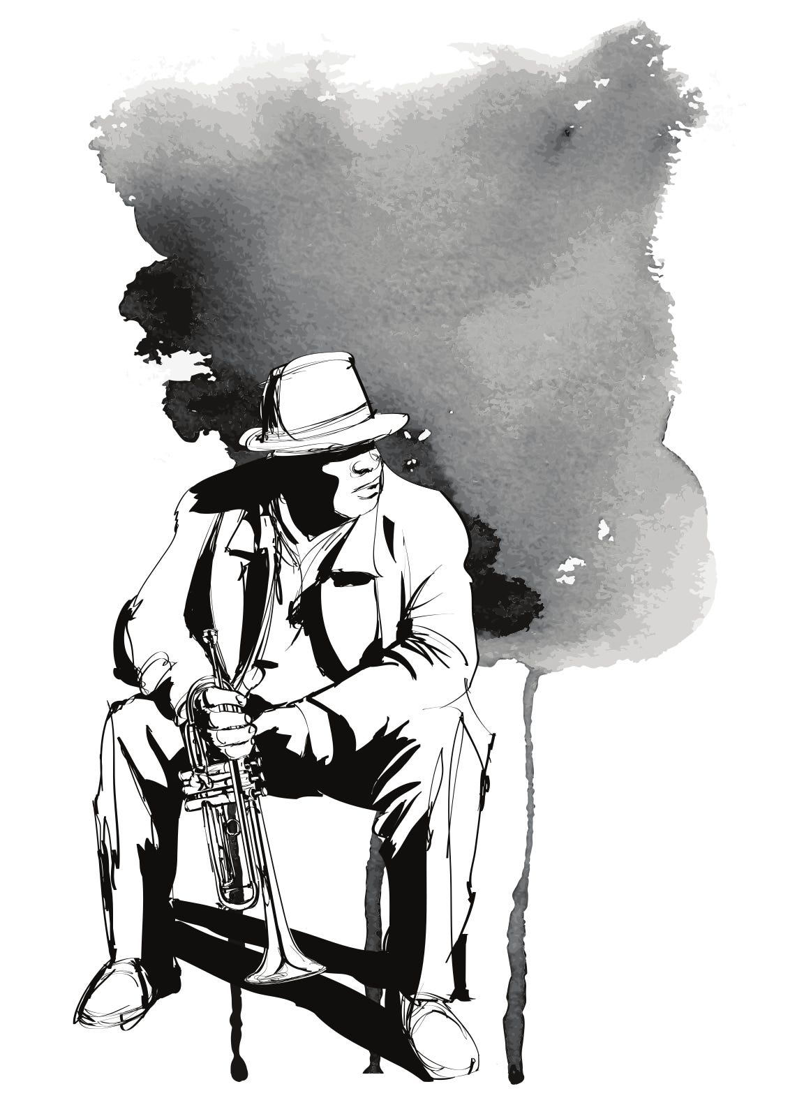 He was just resting there, his horn sitting in his lap as though he’d been playing for the quarters passers-by would drop in his hat, overturned on the sidewalk at his feet. The nearest street lamp was burned out, but in the glow from the lamp down the path a ways, I could see that his coat was worn and his trousers were shiny at the knees.